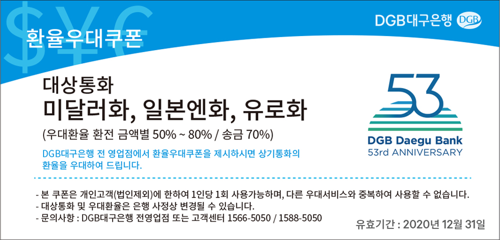 DGB대구은행에서 제공하는 2020년 환율우대쿠폰 50~80% 이다.