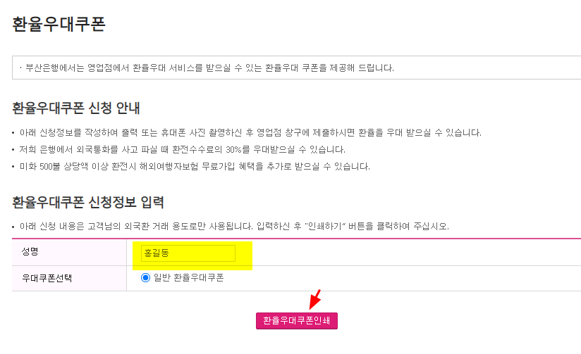 간단히 이름을 입력하면 환전쿠폰을 다운 가능하다.