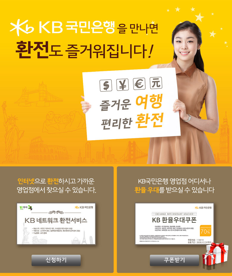 본 쿠폰은 KB국민은행 전국 영업점(단, 서울역환전센터 제외)에서 사용가능하며, 다른 환율우대 서비스 중복 우대 불가능합니다.