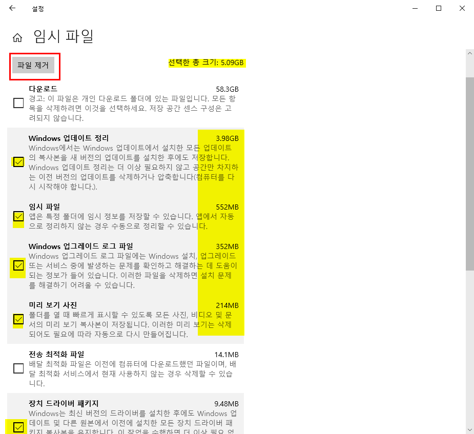 4. 기본적으로 쓸데없는 정리할 것은 체크가 되어 있다.