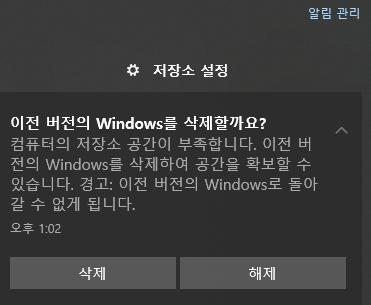 | 이전 버전의 윈도우를 삭제할까요? 컴퓨터의 저장소 공간이 부족합니다. 이전 버전의 윈도우를 삭제하여 공간을 확보할 수 있습니다. 경고 : 이전 버전의 윈도우로 돌아 갈 수 없게 됩니다. [삭제] / [해제] |