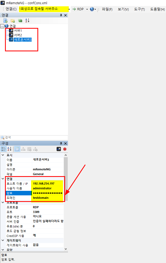 -하단의 연결 항목에 호스트 이름(ip), 사용자이름, 암호, 도메인 등을 추가할 수 있다.