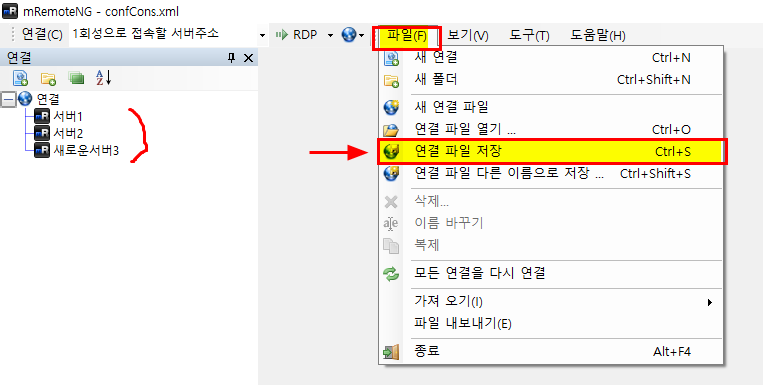 4. 만약 연결정보를 추가하거나 수정을 했을 때는 반드시 메뉴 [파일] -> [연결 파일 저장]을 잊지 말고 해 주자.