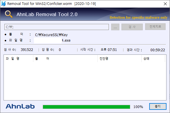 - 전용백신 실행 후 시스템에 예상치 못한 문제가 발생하거나 이로 인해 데이터 또는 금전적 손실이 생길 수 있으니 이를 고려하여 사용을 결정하십시오.