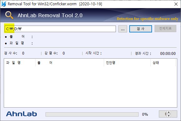 실행하면 C드라이브와 D드라이브가 자동으로 나오는데, C드라이브만 검사하려면 C:\ 만 남겨두면 된다.1. 다운 받은 파일을 실행하면 바로 전용백신 화면이 열린다.