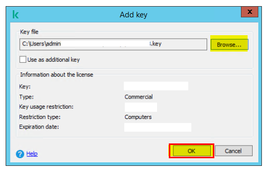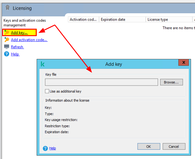 왼쪽 메뉴 Licensing 에서 [Add key]를 누르면 설치화면처럼 키 파일 불러올 수 있는 메뉴가 나온다.