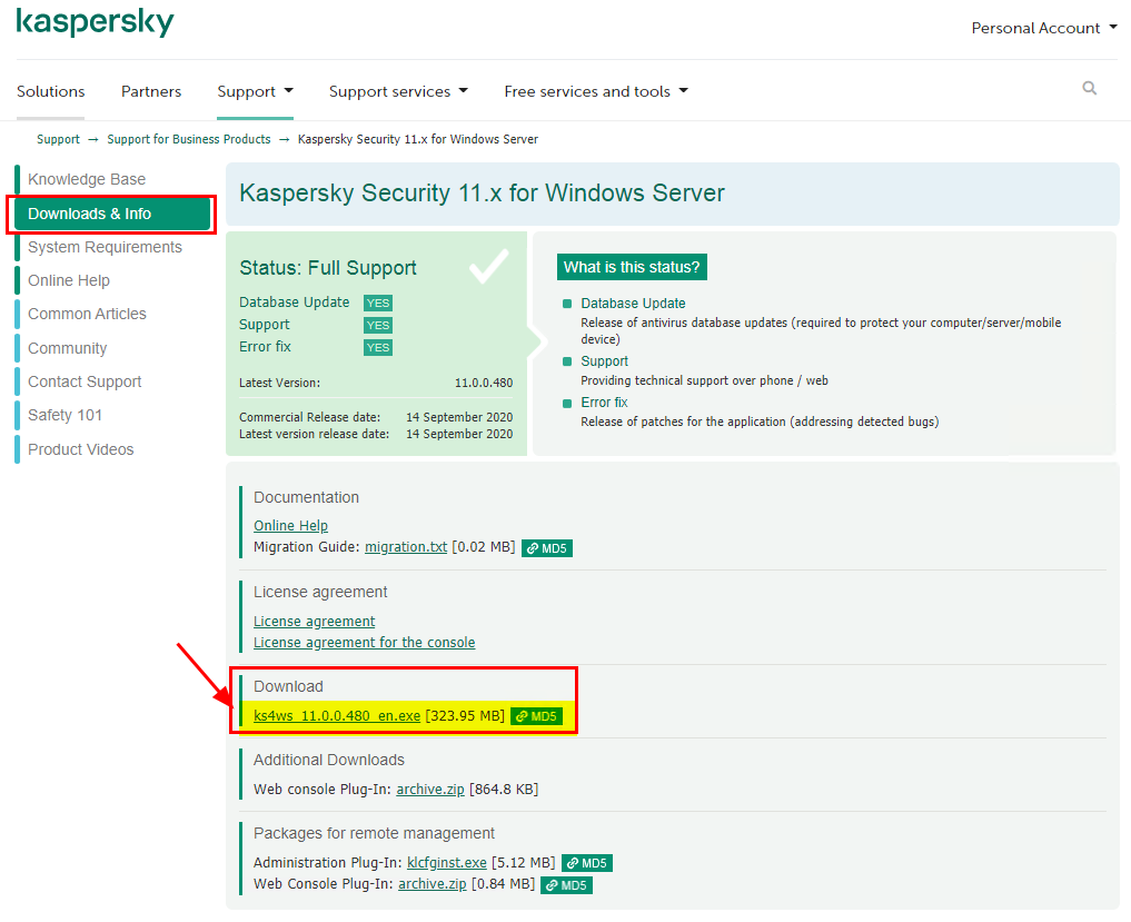 2. 왼쪽편에 [Downloads & Info]를 클릭하면 Kaspersky Security 11.x for Windows Server 프로그램을 다운 받을 수 있다.