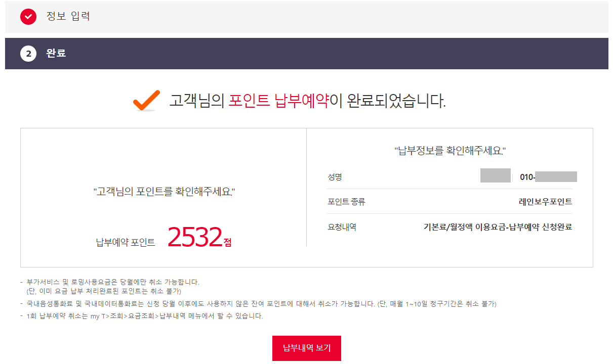 그러면 아래와 같이 레인보우 포인트 납부 예약이 완료되었다고 나온다.