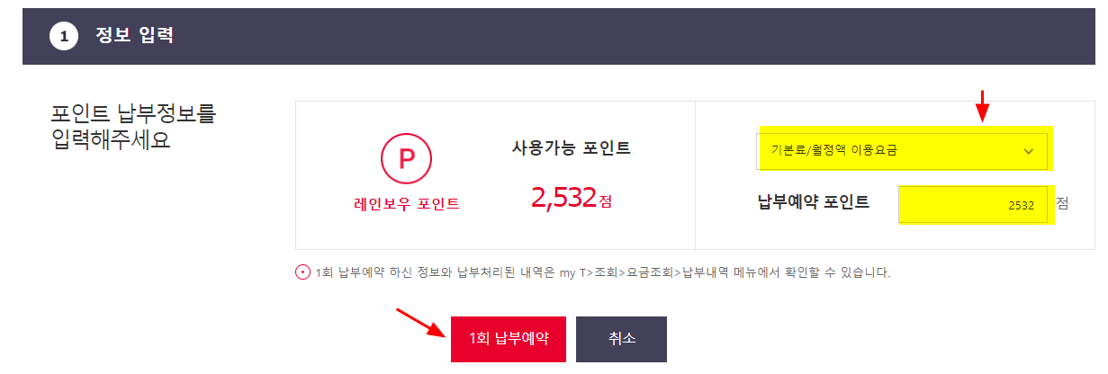 레인보우 포인트 납부 항목을 선택을 할 수 있는데, 간단히 기본료/월정액 이용요금을 선택해서 남은 레인보우 포인트 전체를 입력해 주었다. [1회 납부 예약] 클릭