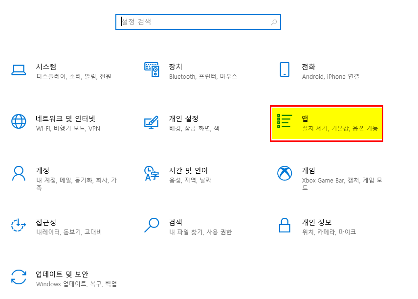 2. 시작 메뉴 -> 설정 선택(톱니 모양) -> 앱 선택
