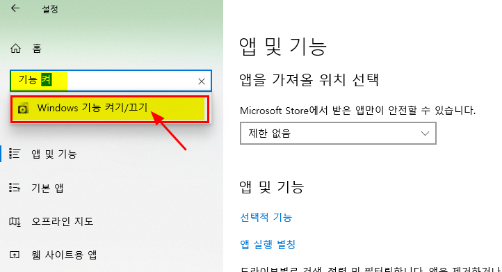 5. 설정 창으로 돌아와서 검색에 "기능 켜"까지 입력하면 아래에 [Windows 기능 켜기/끄기]가 나온다. 선택하자.