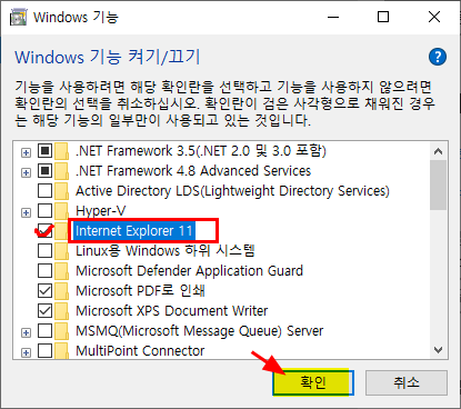 6. 윈도우 기능 켜기/끄기 창에서 [Internet Explorer 11]항목을 체크하고 [확인]을 하면 끝이다.