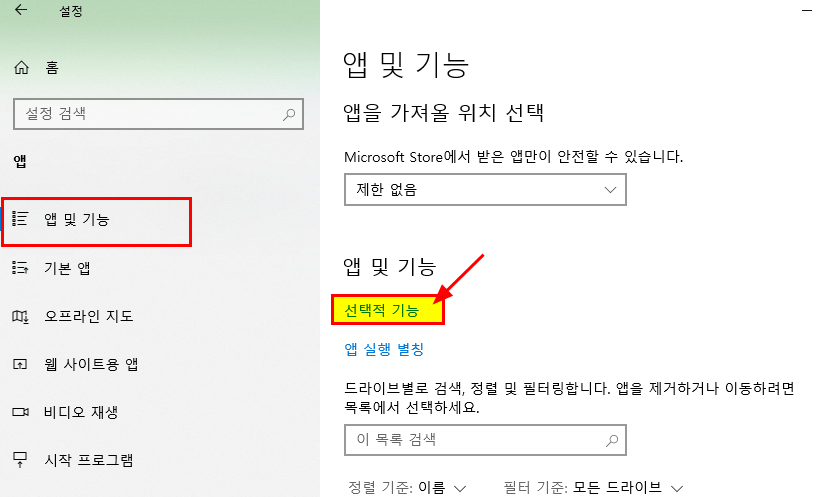3. [앱 및 기능] 왼쪽 메뉴에서 [선택적 기능] 클릭