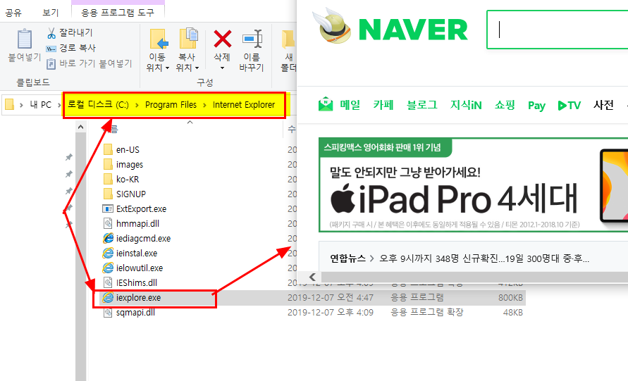 해당 폴더에 iexplore 파일(iexplore.exe)이 없거나 실행을 해도 정상적으로 되지 않는다면 다음과 같이 해 보자.