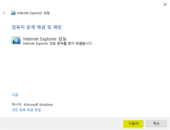 1. Internet Explorer 11 문제 해결사 실행을 하자.