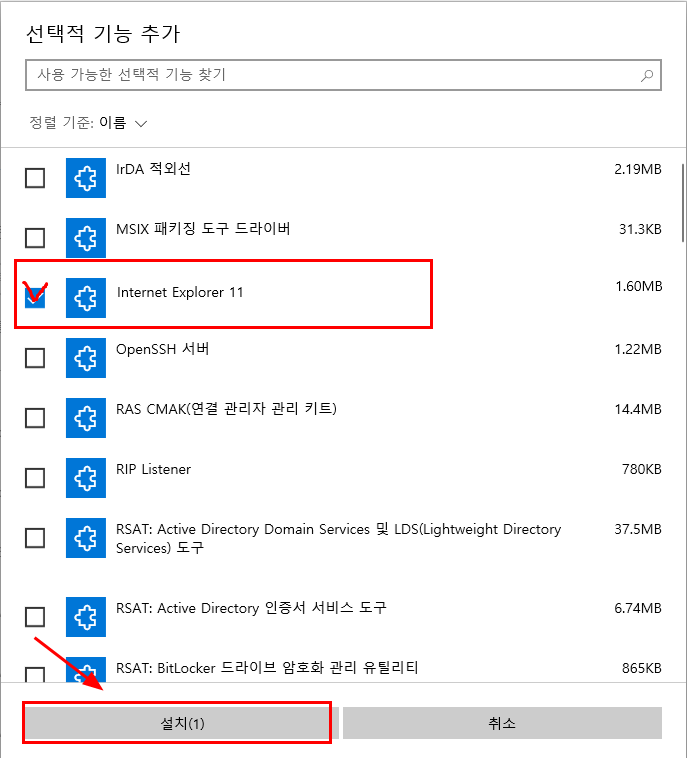 4. [기능 추가] 클릭하여 Internet Explorer 11 를 체크하고, 아래 [설치] 클릭