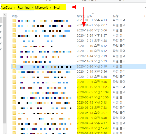 3. 아마 폴더나 하나 열어서 주소 부분에 복사해서 엔터를 치면 아래와 같이 자동 복구 폴더 위치에 들어갈 것이다.