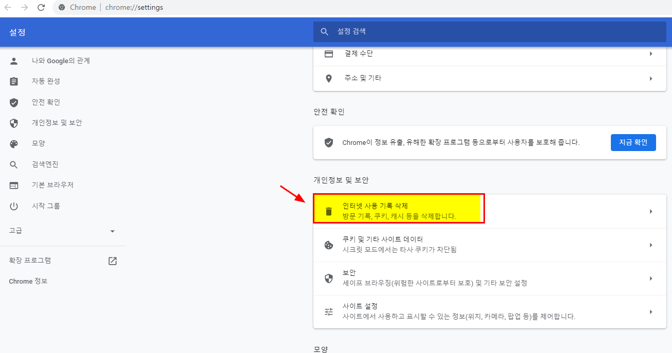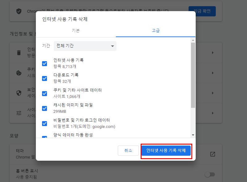 중간에 보면 [인터넷 사용 기록 삭제] 가 를 클릭