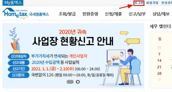 1. 홈텍스 사이트(www.hometax.go.kr/)로 접속 합니다. 위쪽에 [로그인] 표시를 클릭