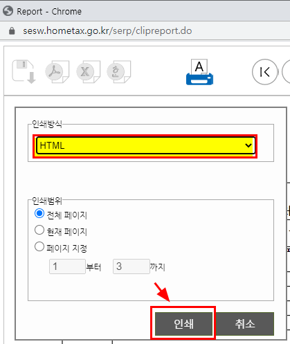 7. 인쇄방식 선택화면이 나오는데 그대로 HTML 로 하고 [인쇄] 클릭