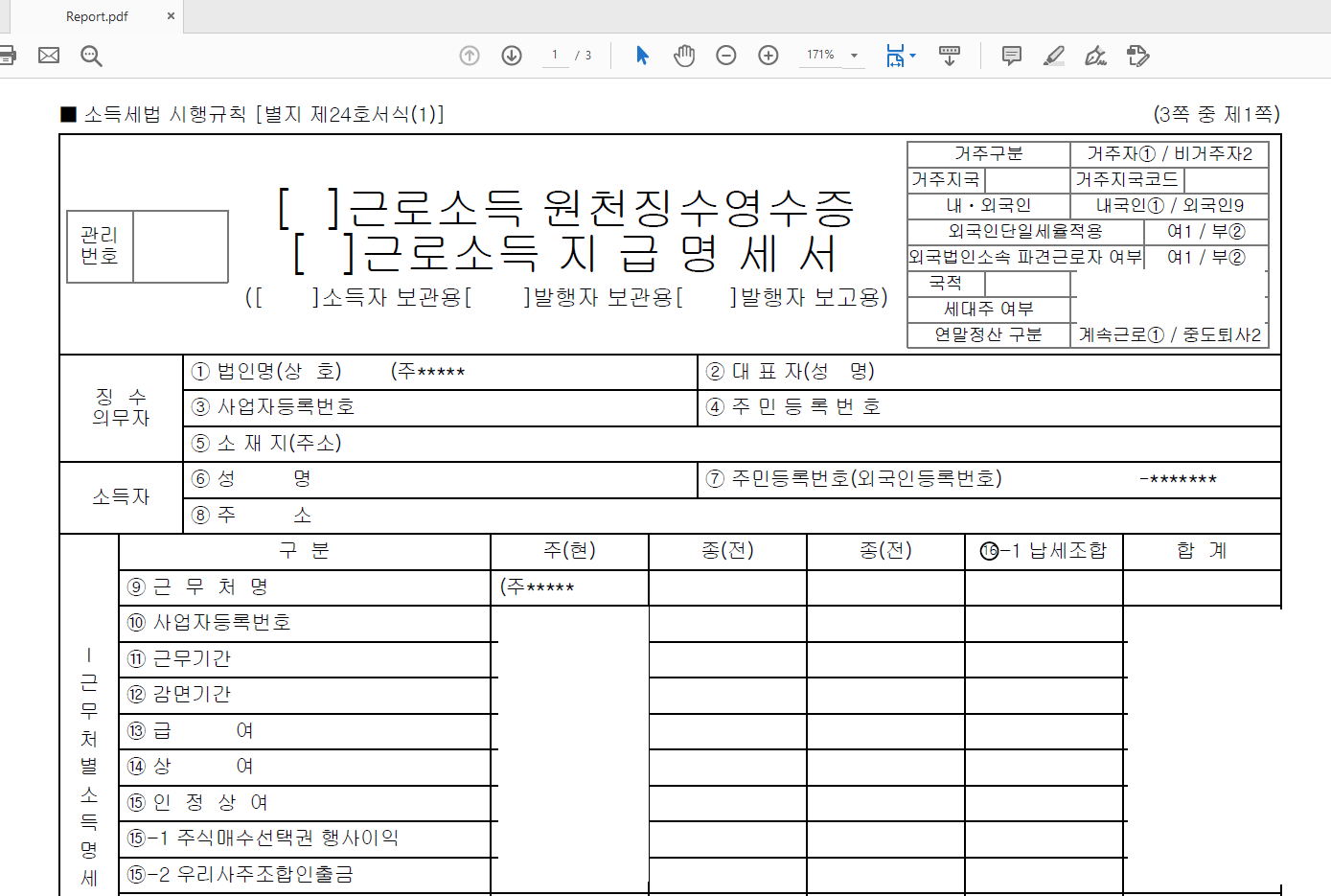 다행히 근로소득 원천징수영수증 이미지도 여러페이지 이지만, 페이지마다 생성이 되어 있다.