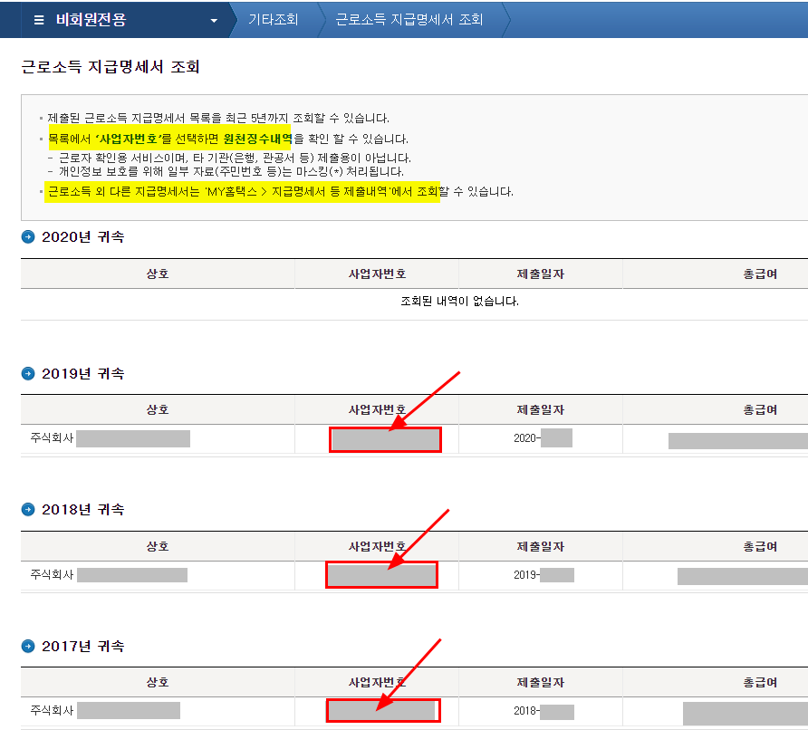 다만 2019년 귀속부터 직장생활을 했었다면 최근 5년까지 조회가 가능하다.