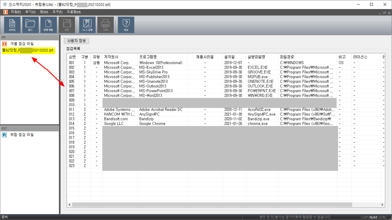 개별 점검 파일을 선택하면 각 사용자별로 소프트웨어 리스트 들이 나온다.