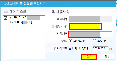 회사명(부서명)도 적당히 입력해 주어야지만 반드시 진행이 가능하다. 브랜드 PC/조립PC 선택하고..[확인] 해 주면 시작된다.