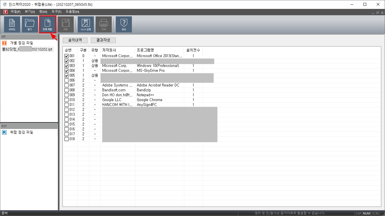 11. 메뉴의 전체취합을 하면 사용자 전체 기준으로 소프트웨어 리스트들이 나오며...