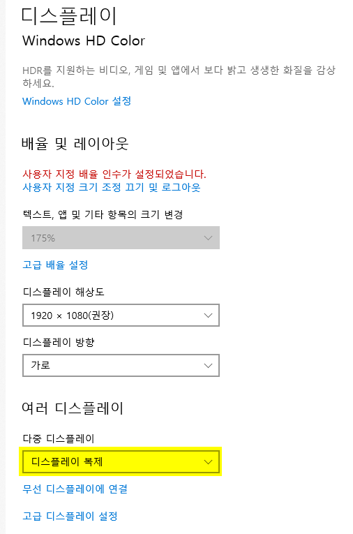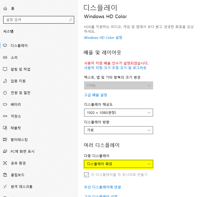 4. 듀얼 모니터를 연결된 상태에서 아래로 내려오면 '여러 디스플레이' 해서 다중 디스플레이 관련하여 설정하는 항목이 나온다.