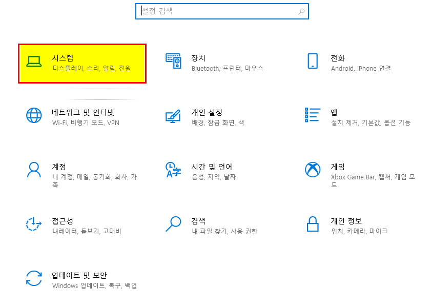1. 시작 - 설정 메뉴에서 [시스템]을 선택하자.