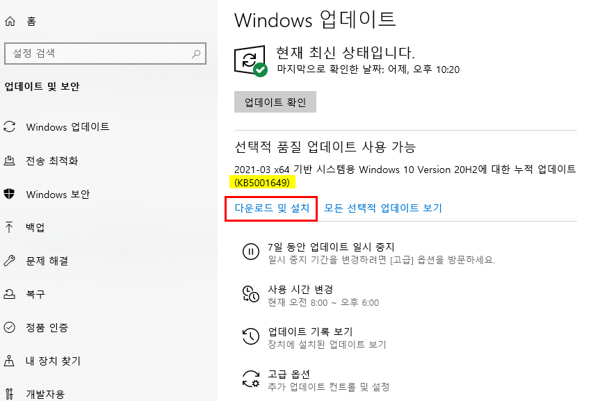 3. 업데이트 확인 버튼을 눌러서 진행하거나 똘82닷컴의 경우는 현재 좀 더 누적 업데이트 KB5001649 가 바로 나와서 해당 [다운로드 및 설치]를 해 주어도 문제는 해결이 된다.