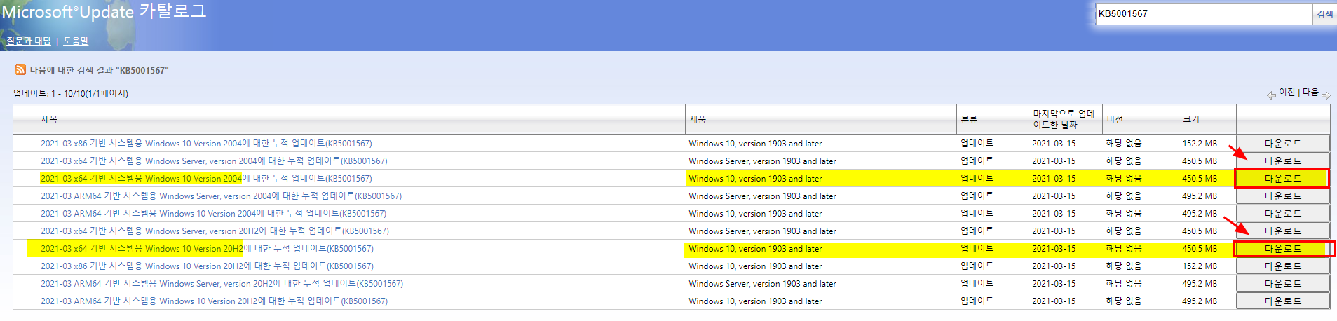 Microsoft Update 카탈로그 - KB5001567 패치 다운로드 (Windows 10 버전 20H2/2004용)