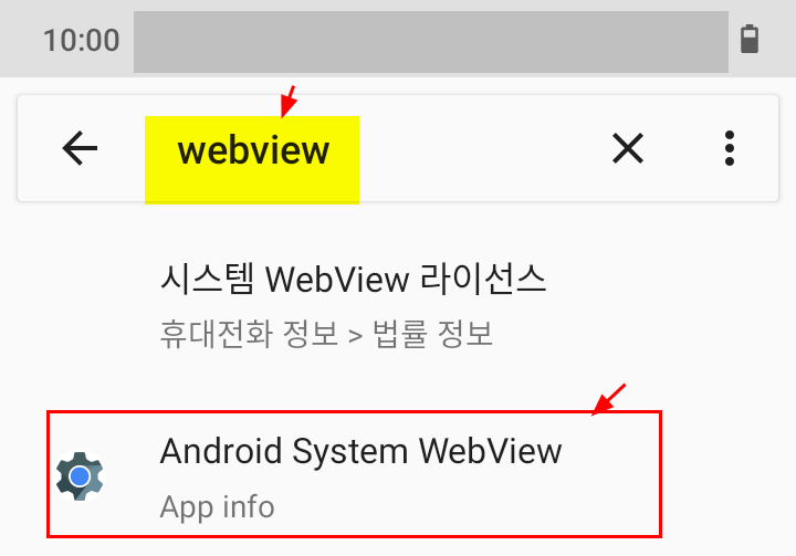2. 설정화면에서 검색으로 webview 를 입력 후 기다리면, 아래쪽에 Android System WebView 라고 나온다.