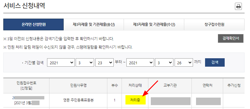 8. 서비스 신청내역 화면에서 방금 전 신청한 영문 주민등록표등본을 볼 수 있으며, 현재 처리상태가 '처리중'으로 나옴을 볼 수 있다.
