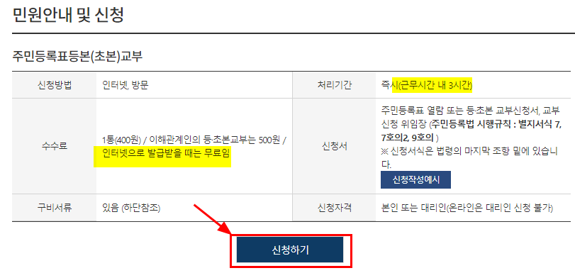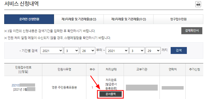 온라인 발급(본인 출력)을 선택하여 최종 [민원 신청하기]를 클릭하면 완료된다. 이제 인쇄할 일만 남았다.