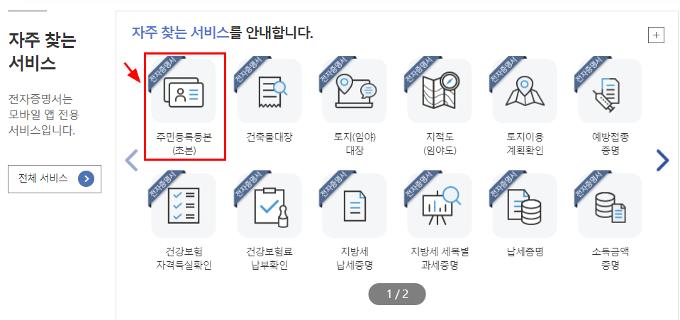 3. 첫 화면에서 바로 주민등록등본(초본)을 클릭한다.