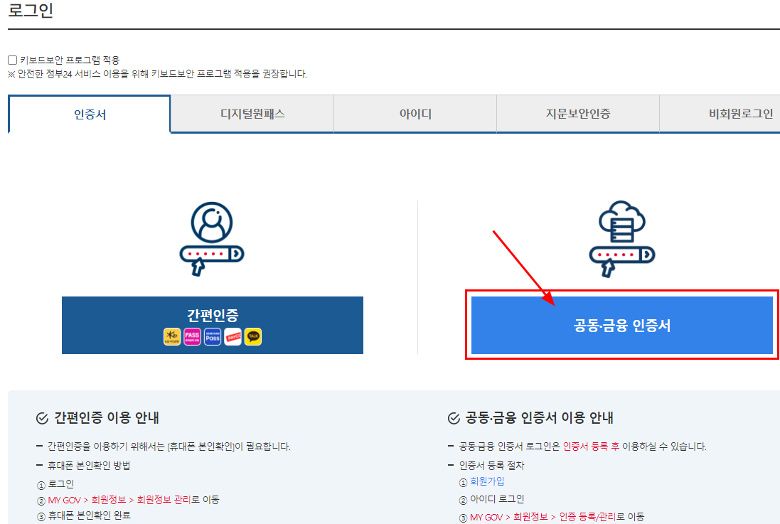 간편인증, 공동금융인증서 등 인증서 방식 및 다양한 로그인 방식이 존재한다.