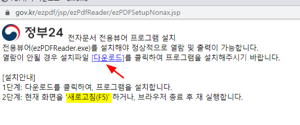 11. 정부24 전자문서 전용뷰어 프로그램 설치해서 ezPDFReader.exe 를 설치해야 한다고 하며, [다운로드] 를 클릭해도 정상적으로 작동하지 않는다. 새로고침(F5)를 해도 마찬가지이며, 크롬 웹브라우저를 종료 후 재실행 해도 마찬가지이다.