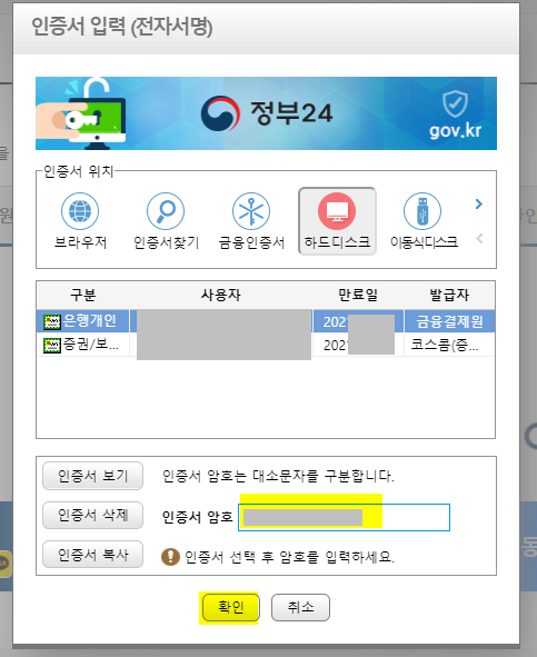 2. 인증서 암호를 입력해 주고 로그인