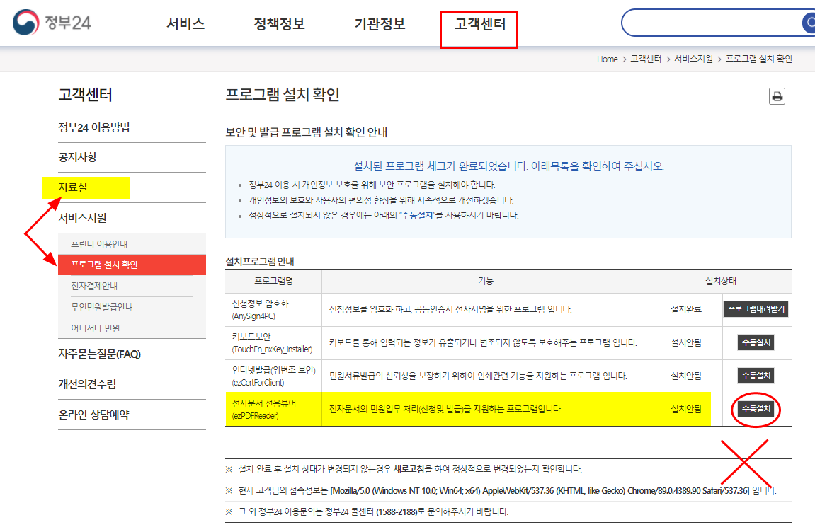 4. 정부24의 메뉴 중 [고객센터] - [서비스 지원] - [프로그램 설치 확인] 을 선택하면 아래와 같이 나온다.