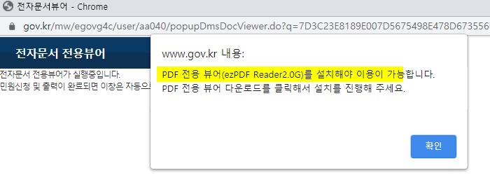 2. 팝업창에서 pdf 전용 뷰어(ezPDF Reader 2.0G)을 설치해야 이용이 가능하다고 안내창이 나온다.