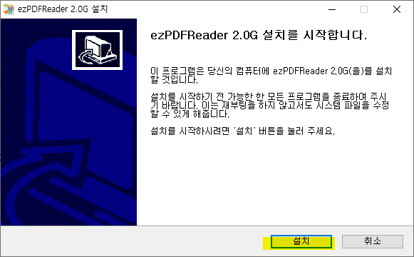 7. 다운받아 실행하면 이렇게 pdf 전용 뷰어(ezPDF Reader 2.0G) 설치를 시작한다고 나온다.