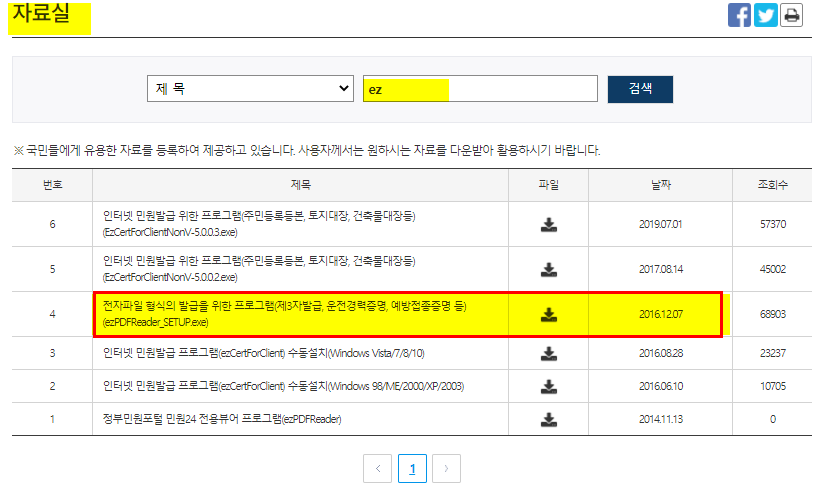 제목에 ez 라고 입력하고 [검색] 클릭하면... 그 중에서 '전자 파일 형식의 발급을 위한 프로그램(제3자발급, 운전경력증명, 예방접종증명 등 ezPDFReader_SETUP.exe' 라고 나온 부분을 클릭하자.