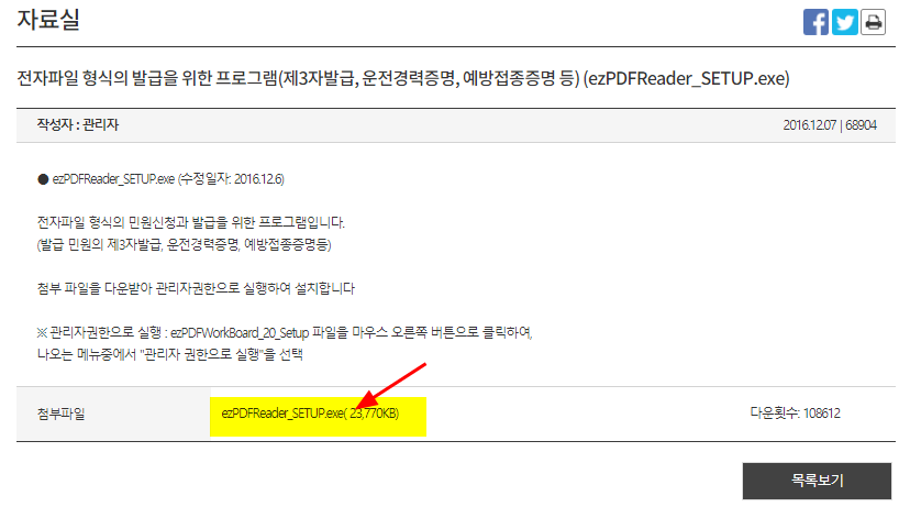6. 아래쪽에 첨부파일 ezPDFReader_SETUP.exe 라고 나와 있다. 수정일자는 2016년 12월 6일이다.