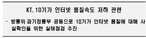 방통위와 과기정통부는 최근 발생한 KT 10기가(Giga) 인터넷의 품질 저하 관련 사실 확인을 위한 실태점검을 공동으로 추진하기로 하였다.