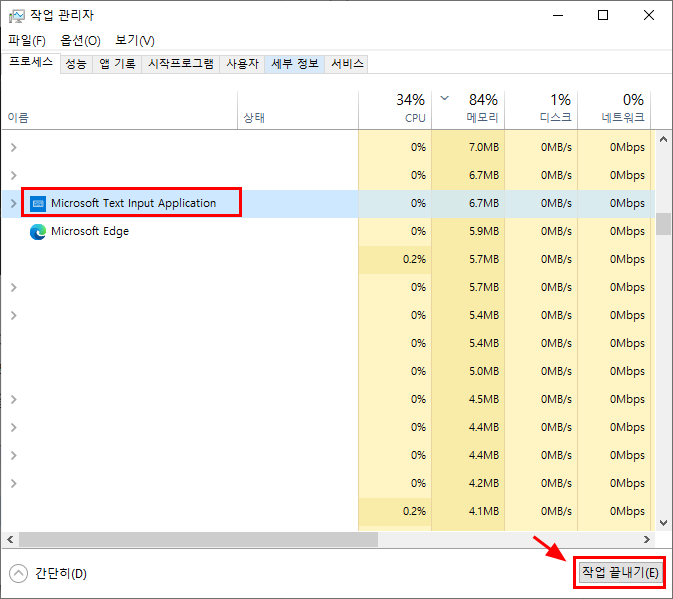 2. 작업관리자 창이 뜨면 첫번째 탭메뉴 (기본 그대로) 에서 Microsoft Text Input Application 을 찾아보자.