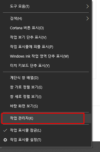 시작표시줄 위에 오른쪽 마우스 -> 작업관리자를 선택