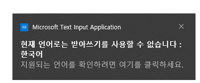 Microsoft Text Input Application 프로그램명이 뜨며, 현재 언어로는 받아쓰기를 사용할 수 없습니다. : 한국어 지원되는 언어를 확인하려면 여기를 클릭하세요.