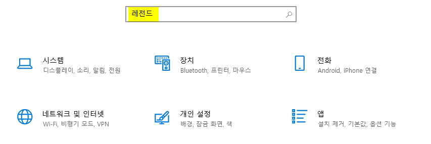 아래는 제어판의 일반 검색항목에 레전드라고 입력하니 정상적으로 나오는 모습이다.